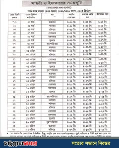 এ সময়সূচি অনুযায়ী, আগামী ২৪ মার্চ প্রথম রমজানে ঢাকায় সেহরির শেষ সময় ভোররাত ৪টা ৩৯ মিনিট এবং ইফতারির সময় ৬টা ১৪ মিনিট।
