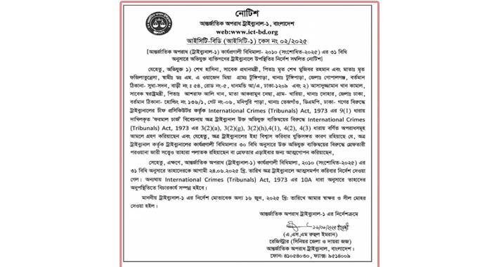 শেখ হাসিনা ও কামালকে আত্মসমর্পণের নির্দেশ দিয়ে ট্রাইব্যুনালের বিজ্ঞপ্তি জারি